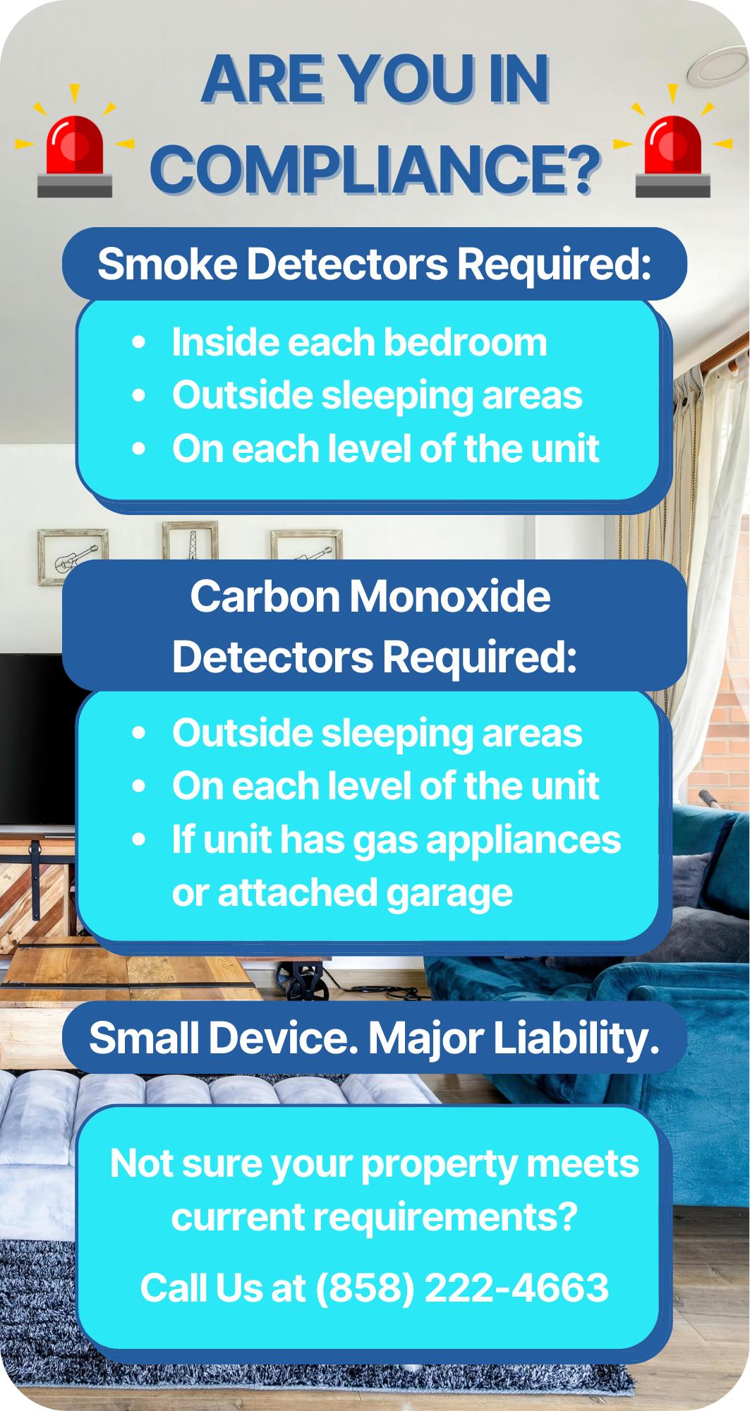 Under California law, how many smoke detectors and carbon monoxide detectors are required in a one-story, three-bedroom apartment?
